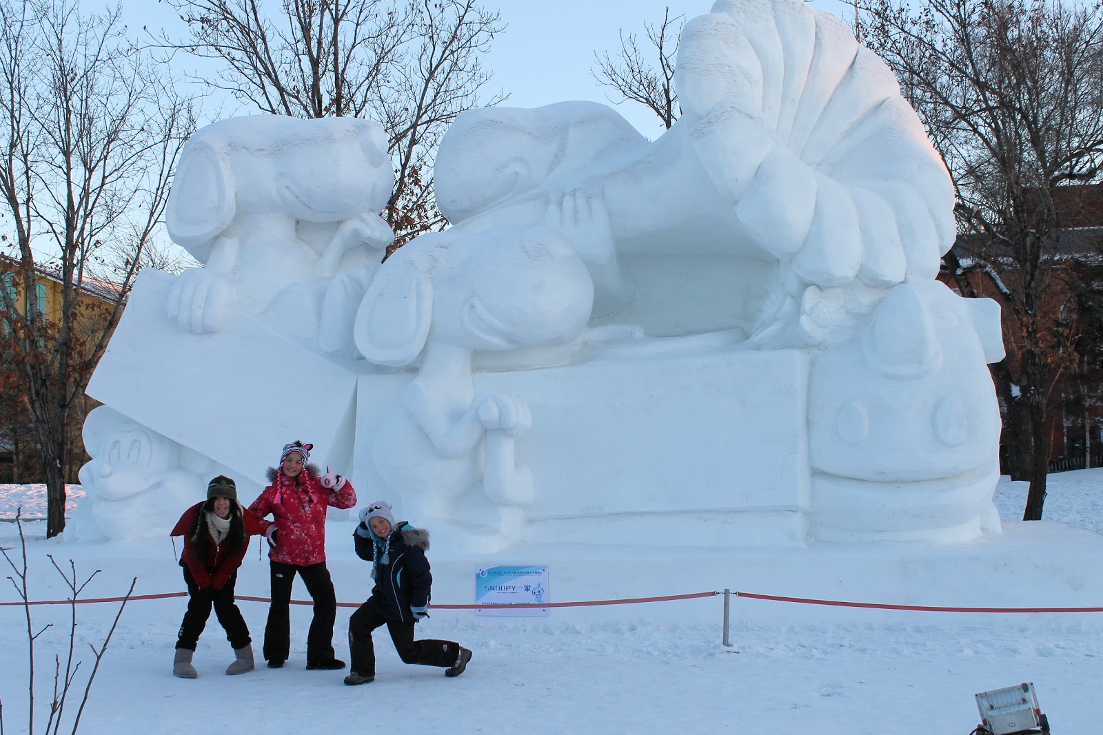 With so many layers on, that we could hardly bend, we made our way to the first stop, the Snow festival. It was absolutely amazing what these people can do with a pile of snow. The artistry of it all was just out of this world. I watched as men chiseled the snow with tools to get every inch of the sculptures as smooth and as detailed as can be! All of the snow there was so white and beautiful...(not all yellow and dirty like in my yard). We were there for a couple of hours and left just at sundown. You could feel the temperatures start to plummet with each passing minute!